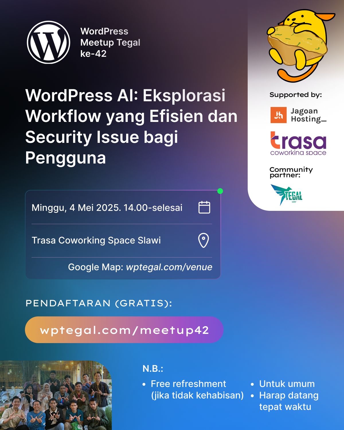 Bagi Anda yang tertarik untuk memahami bagaimana perangkat AI dapat membantu dalam pembuatan website serta dampaknya terhadap pengguna internet secara luas, acara meetup Komunitas WordPress Tegal ini adalah kesempatan yang sayang untuk dilewatkan. Mari bergabung, berbagi pengetahuan, bertukar pengalaman, dan memperluas jaringan dengan sesama pegiat WordPress dalam suasana yang santai dan inspiratif di Trasa Co Working Space, Slawi! Jangan lewatkan kesempatan emas ini untuk meningkatkan pemahaman Anda tentang masa depan pengembangan web dengan WordPress dan AI.